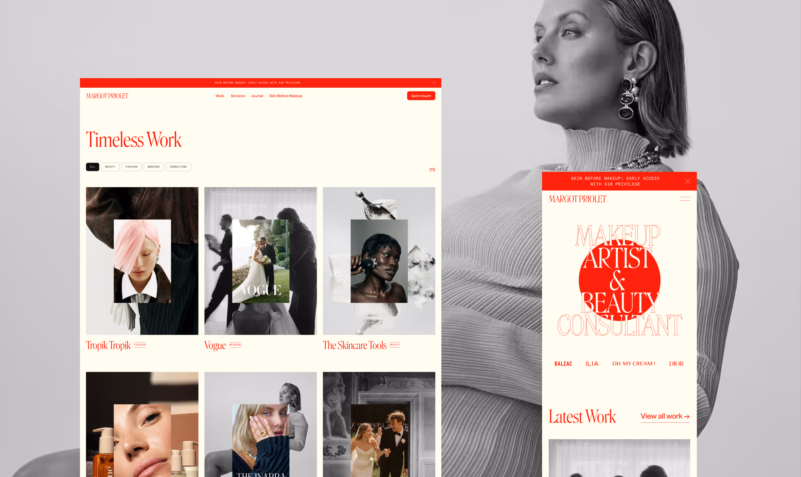 On the technical side, a component-based design system combined with a flexible CMS architecture was developed in Webflow. This approach allows Margot to easily manage and evolve her content, both editorial and portfolio, while maintaining visual consistency, performance, and scalability as her brand continues to grow.