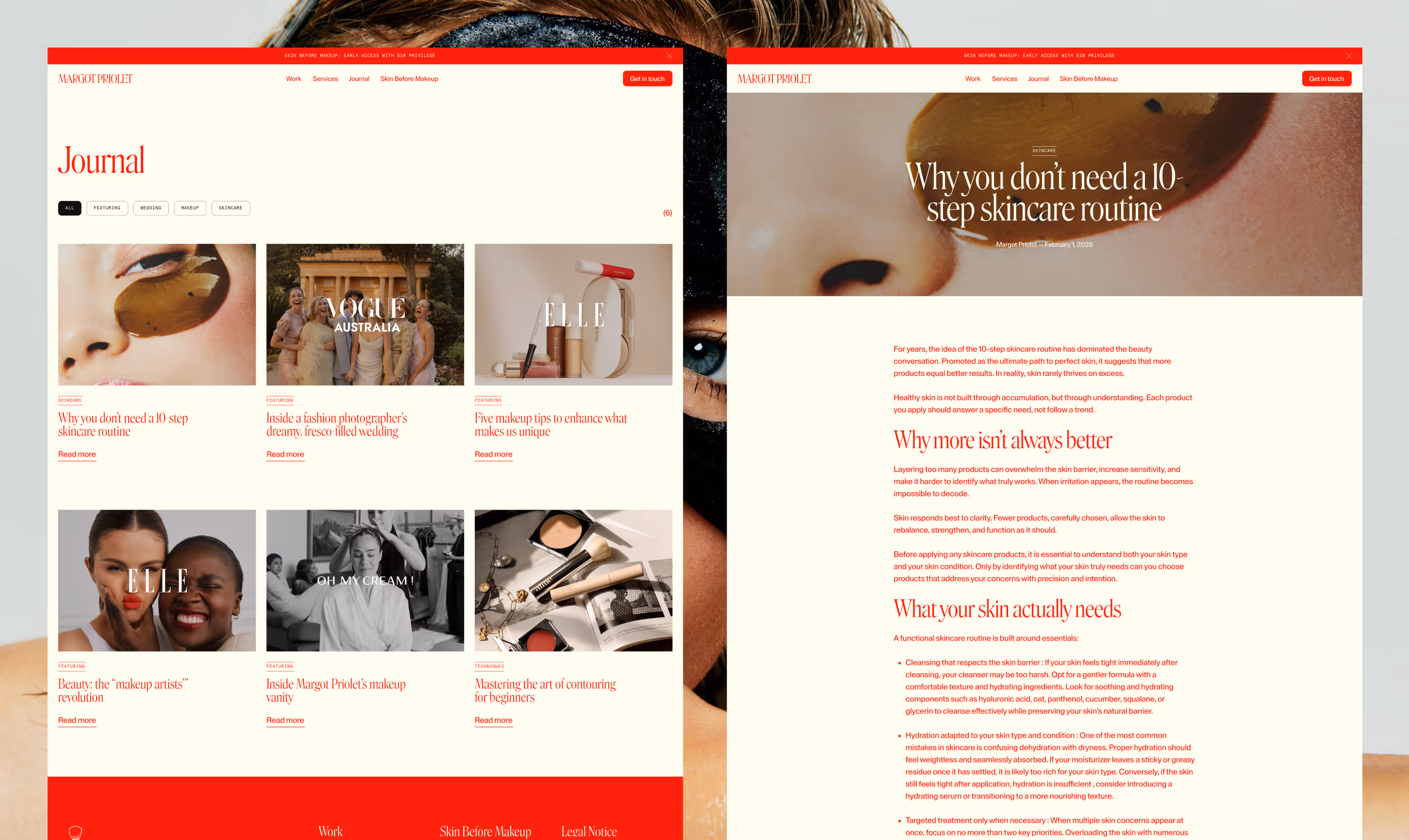 The goal of Margot Priolet’s website redesign was to turn the platform into a refined, scalable showcase for her diverse work, editorial, brand collaborations, and consulting, while giving her full autonomy over content management, without reliance on external technical support.