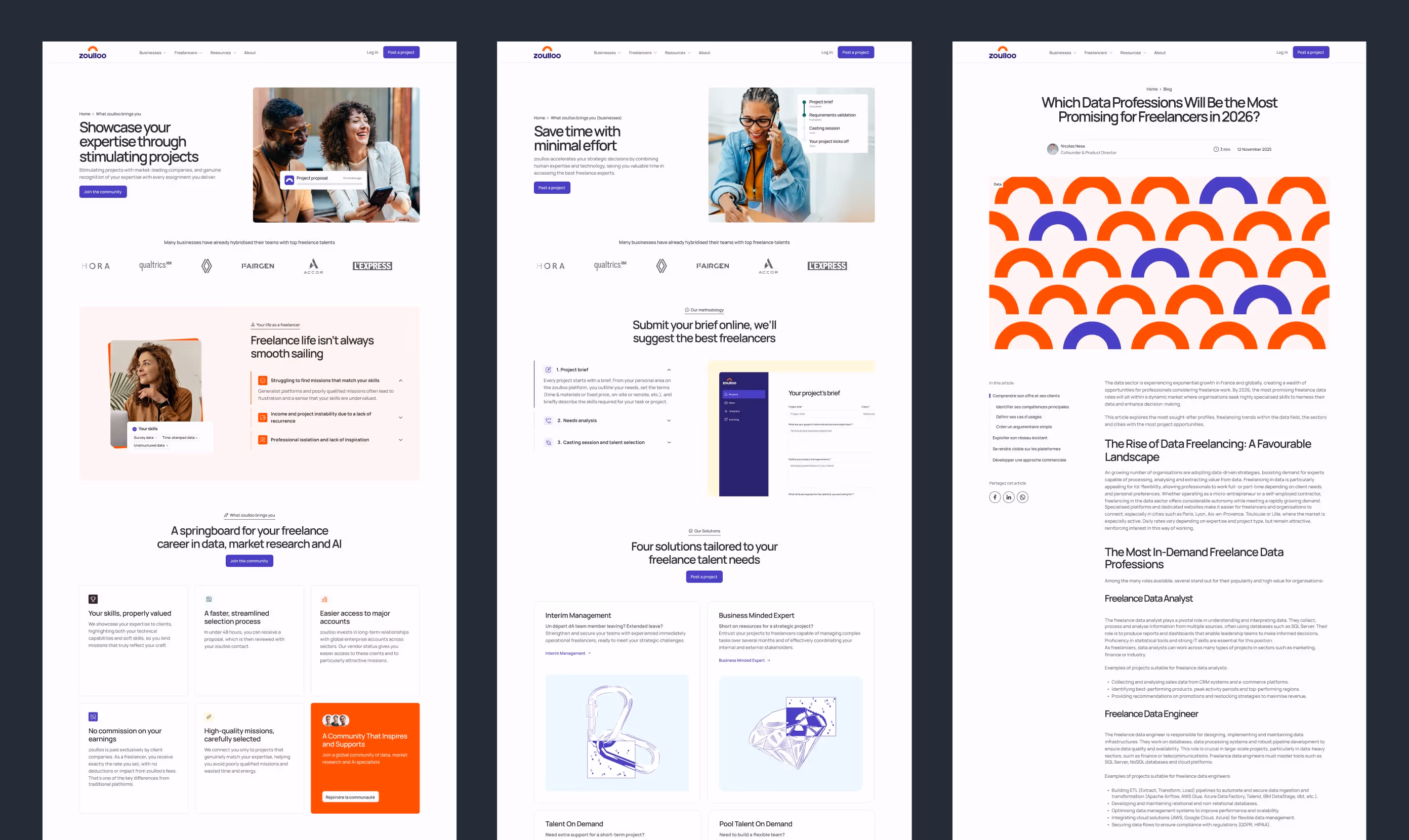The goal of zoulloo’s redesign was to transform the website into a growth engine, not just a visual refresh. We rebuilt the navigation around three strategic entry points: expertises, solutions, and core benefits, ensuring that both enterprise clients and freelancers can quickly find the information most relevant to their needs.